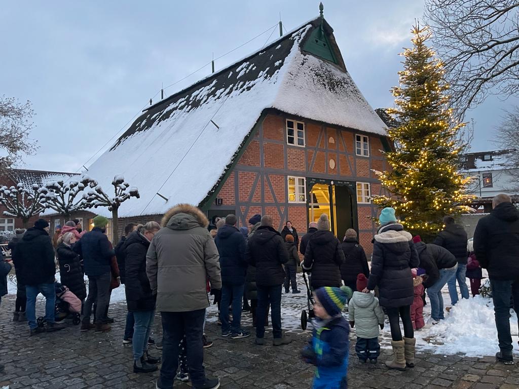 Am Samstagnachmittag fand in Stapelfeld das Tannenbaumanleuchten statt. Der Sozial-, Kultur- und Sportausschuss der Gemeinde hatte dazu in die Kratzmannsche Kate geladen, wo Waffeln, Würstchen im Brötchen und wärmende Getränke wie Kakao und Glühwein ausgegeben wurden. Vor der Kate leuchtete mit Beginn der Dunkelheit der Tannenbaum.