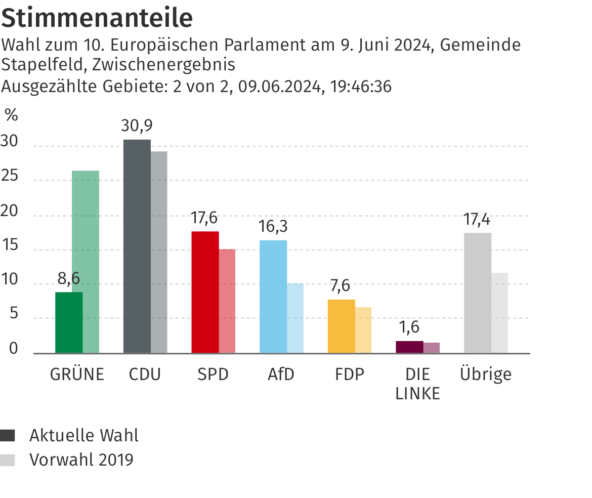 In Stapelfeld hat die CDU am Sonntag bei der Europawahl die meisten Stimmen erhalten und die Wahl mit 30,9 Prozent (+1,7 % gegenüber def Wahl 2019) der angegebenen Stimmen gewonnen. Rang zwei ging an die SPD mit 17,6 Prozent (+2,6 %), Rang drei an die AfD (16,3 %), die gegenüber 2019 mit +6,4 Prozent deutlich […]