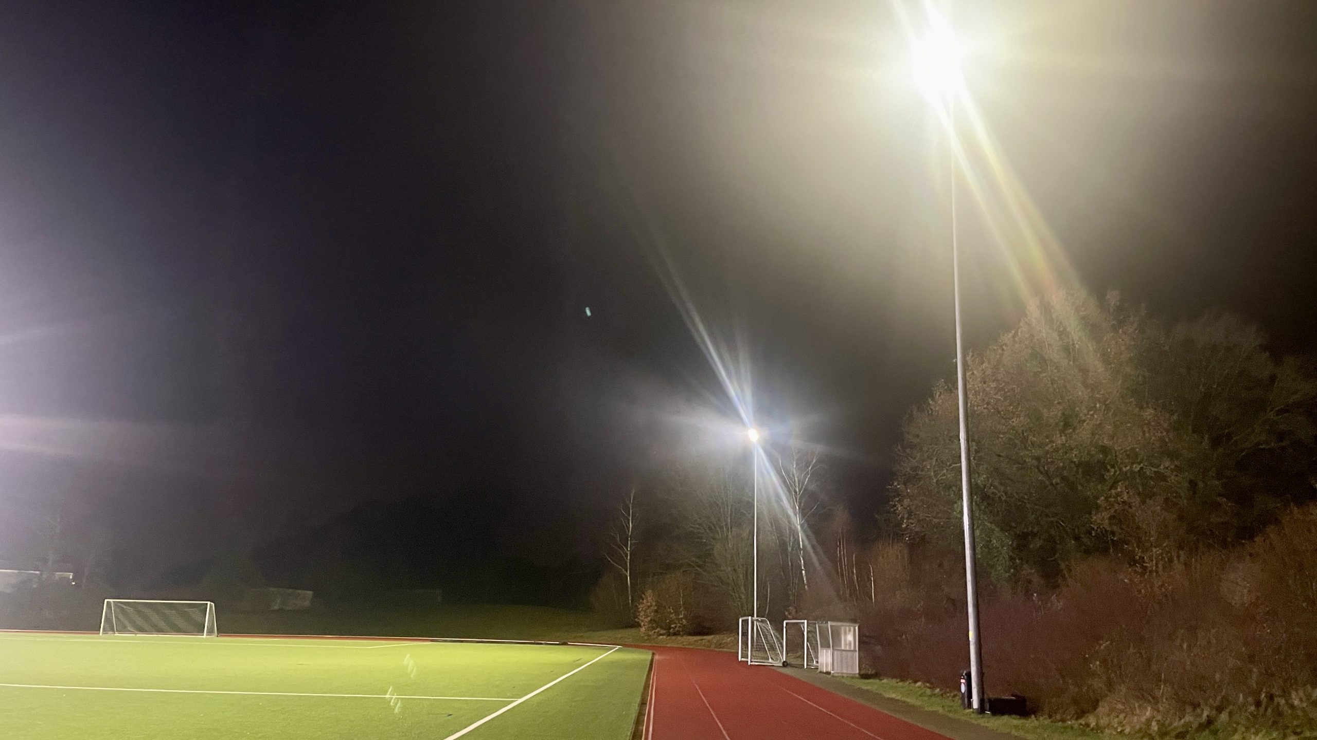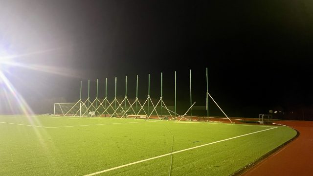 Der Sportplatz Am Drehbarg in Stapelfeld bekommt jetzt seinen Ballfangzaun hinter dem Tor auf der Ostseite, damit die Bälle künftig nicht mehr aus dem angrenzenden Knick oder Feld geholt werden müssen. Außerdem wurde das Flutlicht auf LED-Scheinwerfer umgestellt.